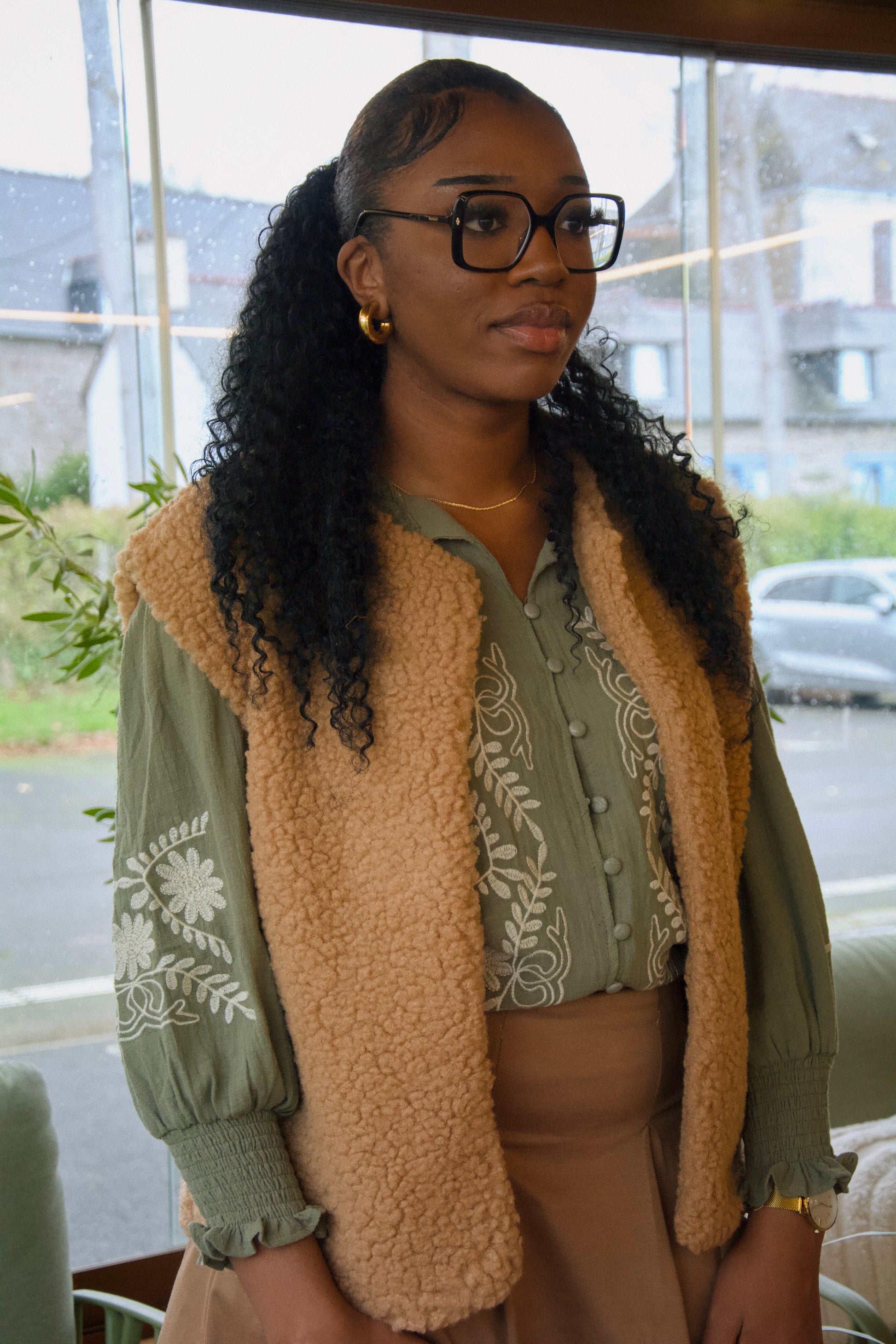La chemise Lara est kaki, avec de belles broderies blanc cassées sur le devant et sur les manches. Les poignées sont resserrées avec un élastique.